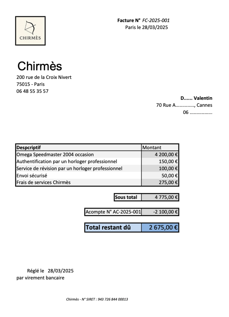Chaque accompagnement est transparent et structuré. Découvrez à quoi pourrait ressembler la facture pour l’acquisition de votre future montre.